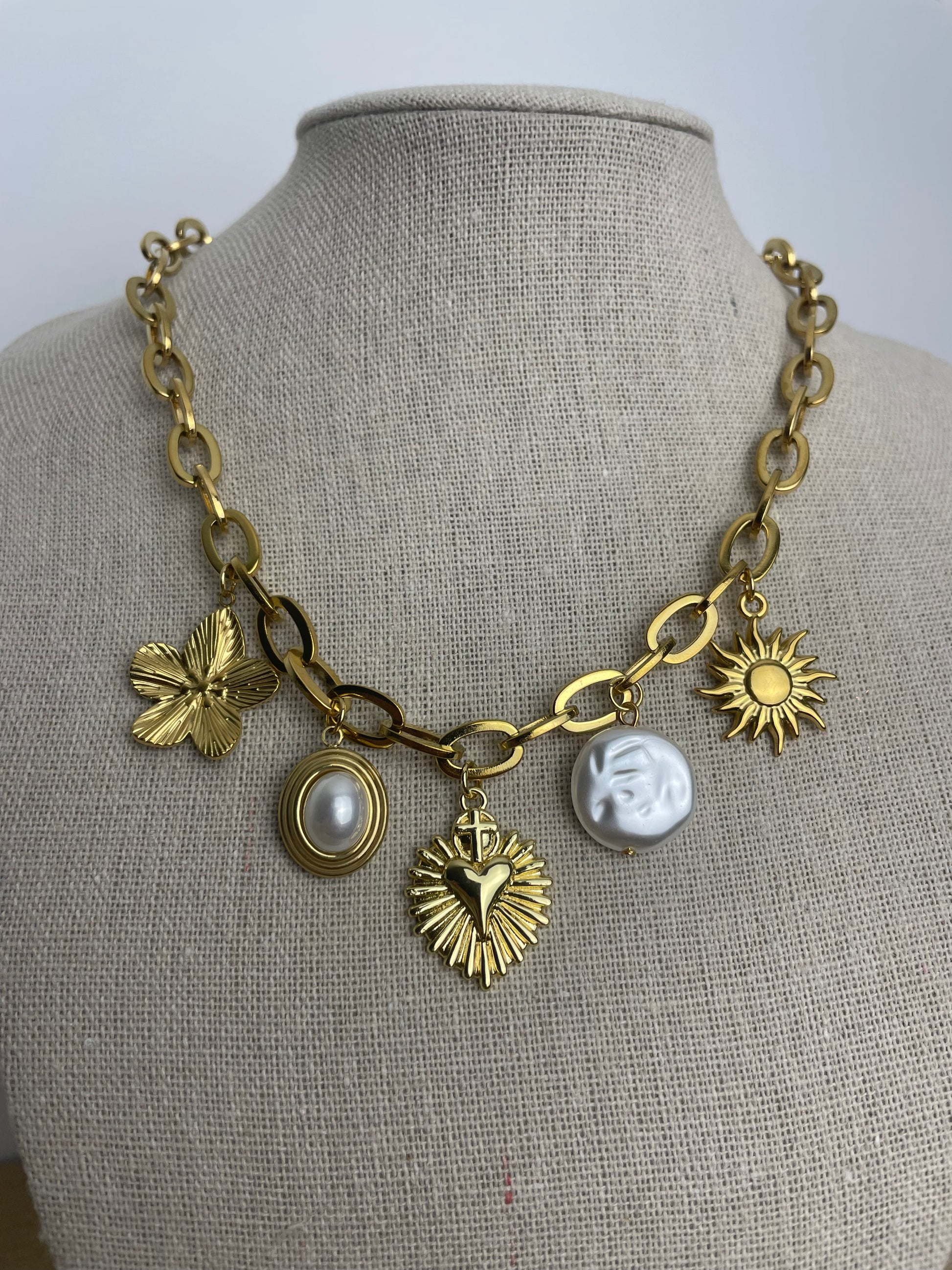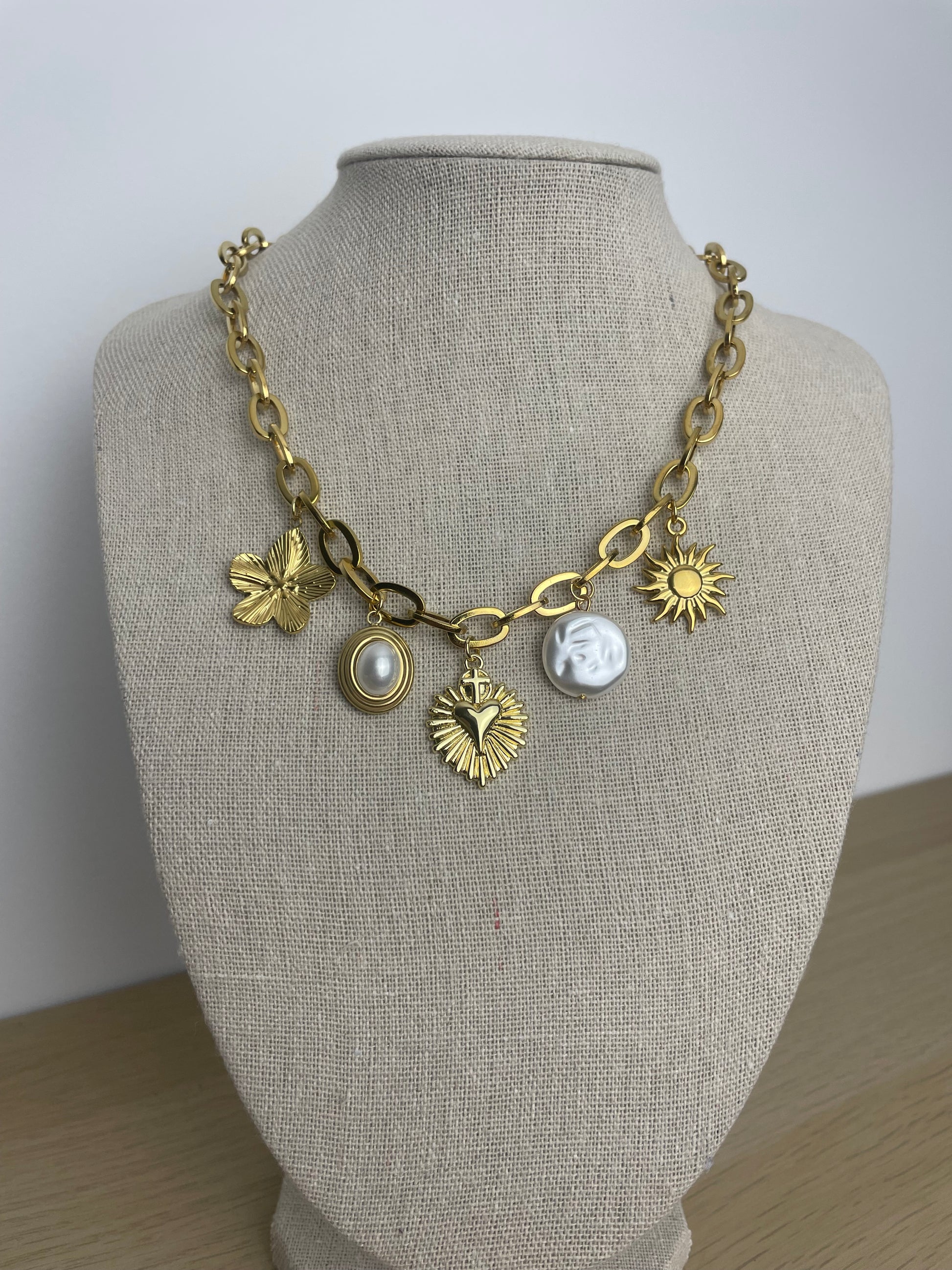 Évoquant la douceur d’une aurore, le collier Eugène mêle breloques douces et délicates.