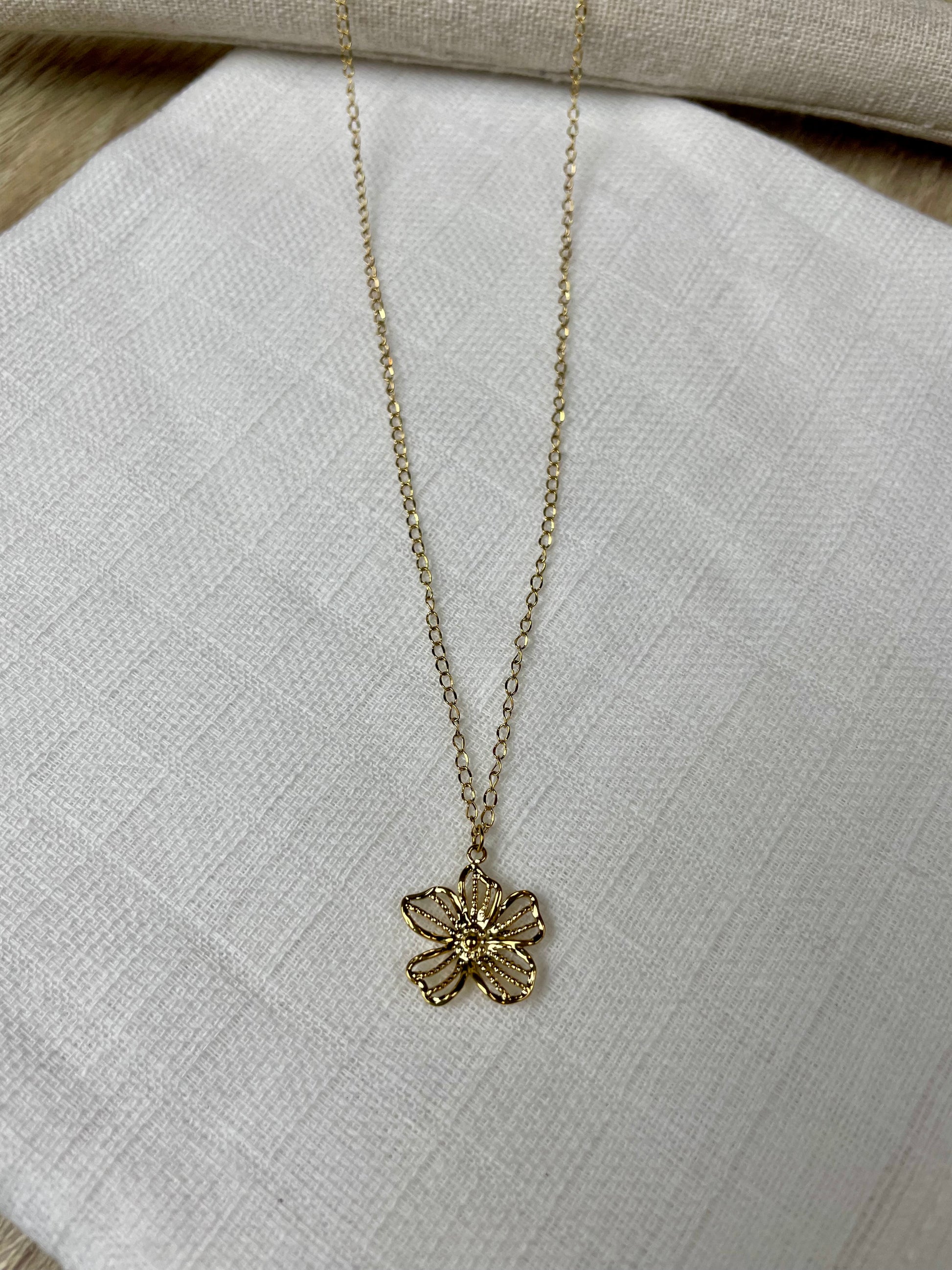 Le collier Marceau séduit par sa chaîne fine travaillée et sa fleur délicatement ajourée. Léger, raffiné et lumineux, il habille le cou avec subtilité et élégance.