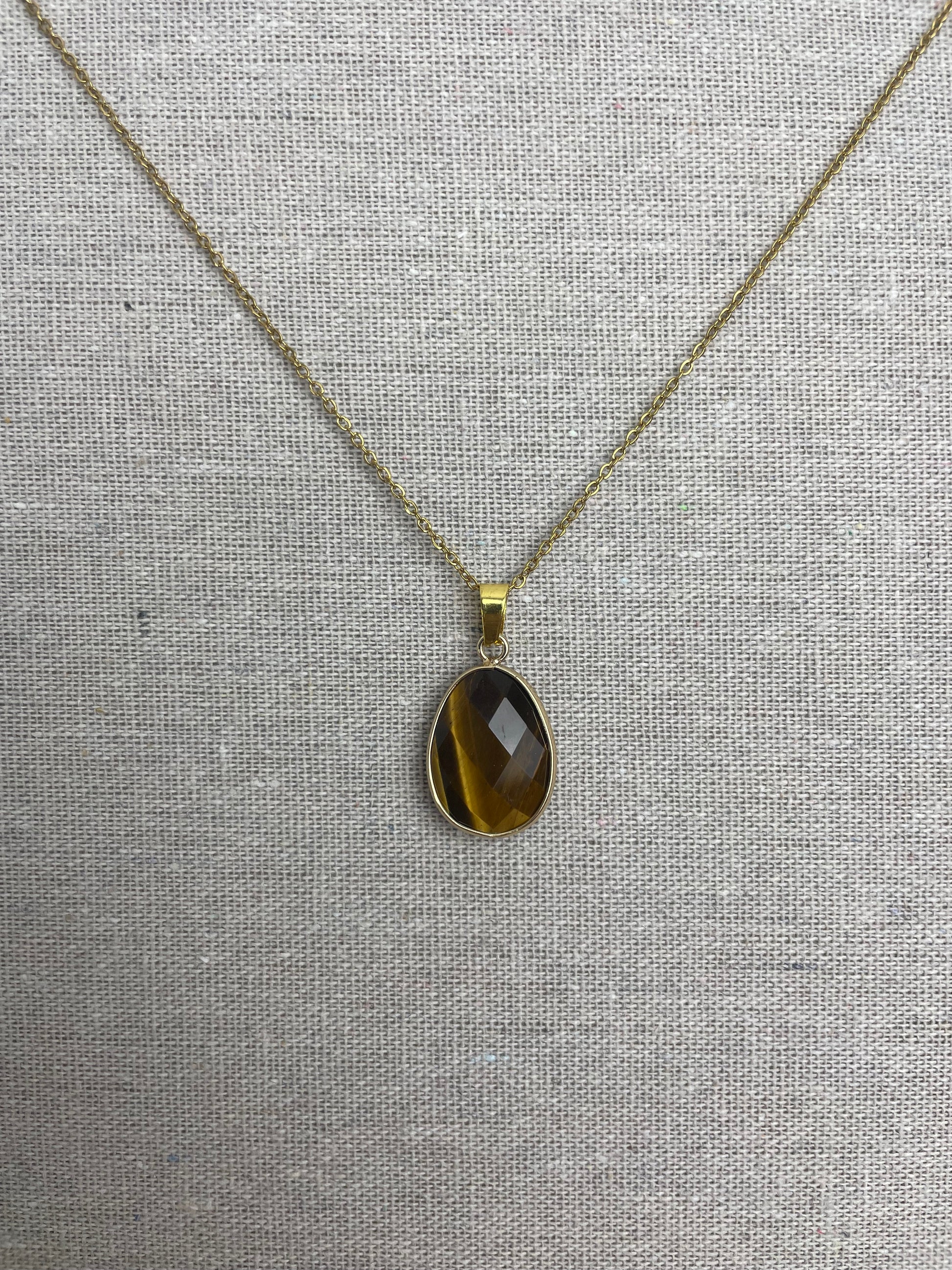 Le collier pendentif en œil de tigre présente une pierre naturelle appréciée pour ses nuances dorées et brunes, offrant une élégance discrète et intemporelle.
